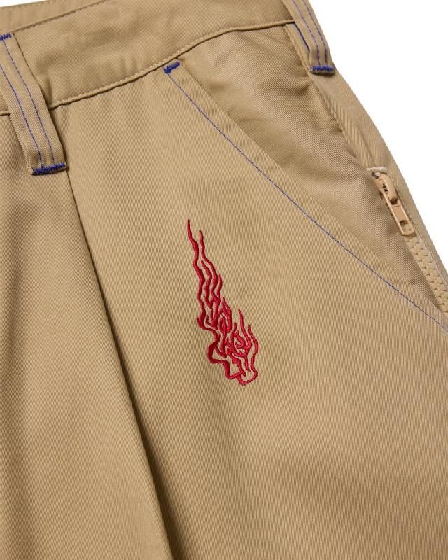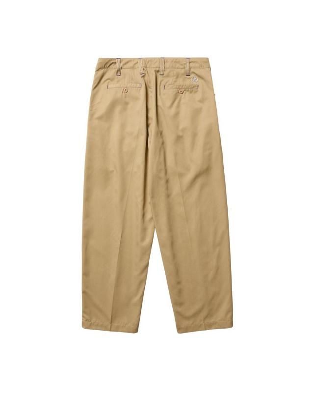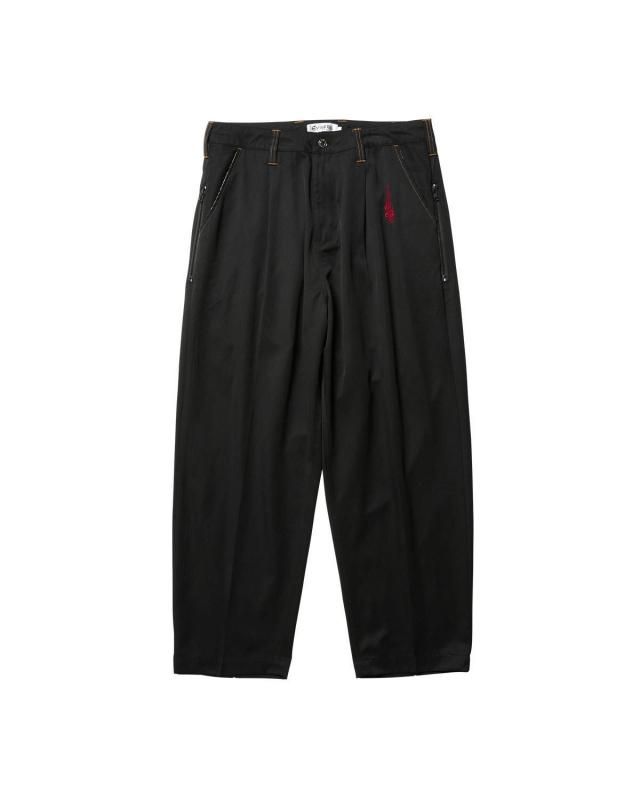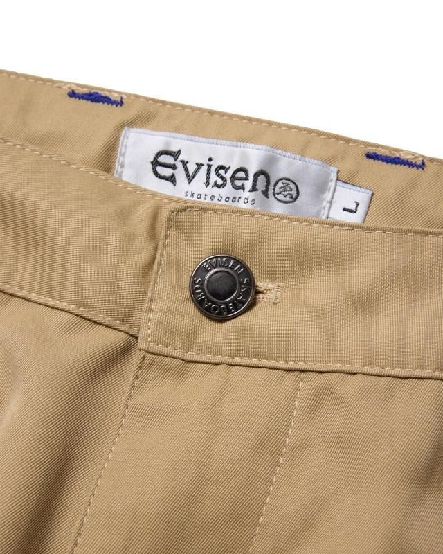 紳士的な印象のテーパードシルエットが人気のEvisen定番アイテム、ボヘミアンパンツシリーズ。今回は耐久性が高く、滑らかさとコットンライクな質感を持った生地を使用。 センタープレス入りで、ウエストにはベルトループと内出しの腰紐付き。フロントはフライファスナー仕様で、タックボタンもロゴ入りのオリジナルデザイン。前後左右の腰ポケットに加え、サイドシームに沿ったジップポケットも左右に追加しました。チャームポイントは、左前ポケット付近に配置した赤いEye Fireグラフィック刺繍。さらにベルトループと、スラッシュポケット、バッグポケットのステッチの色を変えてさりげないアクセントに。右腰にはシルバーの“ゑ”刺繍入り。遊び心のある紳士に思われることうけあいです。