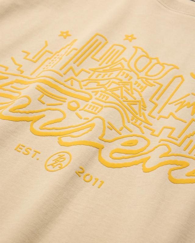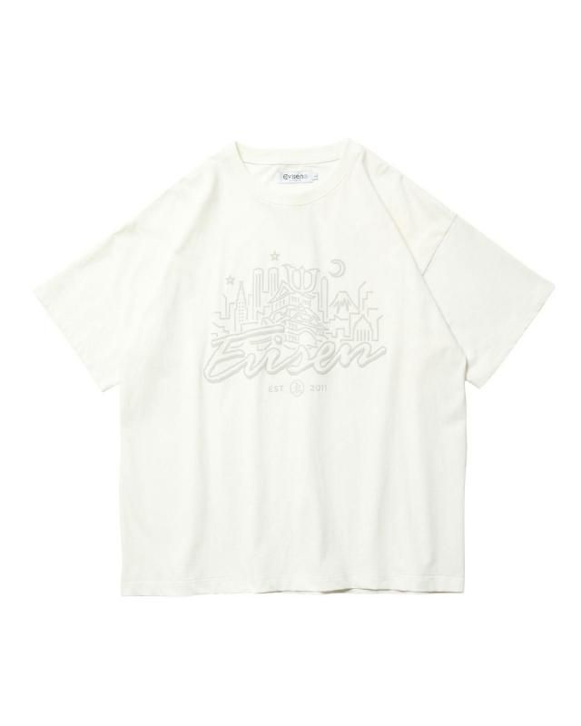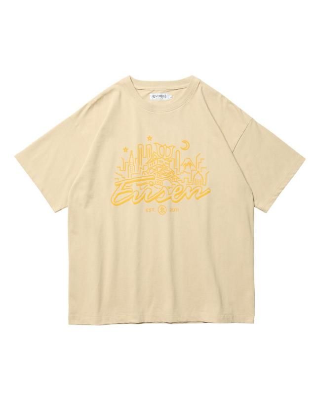 7ozのコットン生地を使用したTシャツ。フロントには発泡プリントでEVICITYグラフィックをオン!程よくワイドなシルエット。Evisen的シティポップTシャツやってみました。