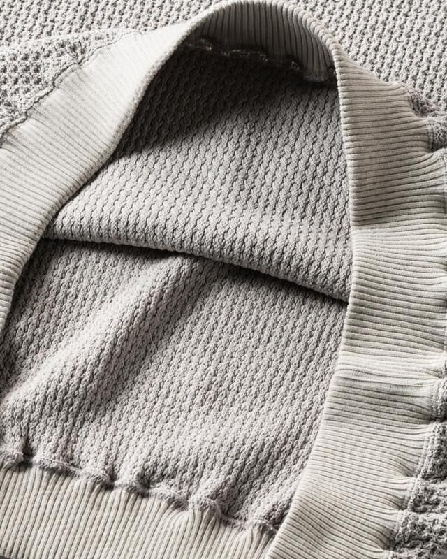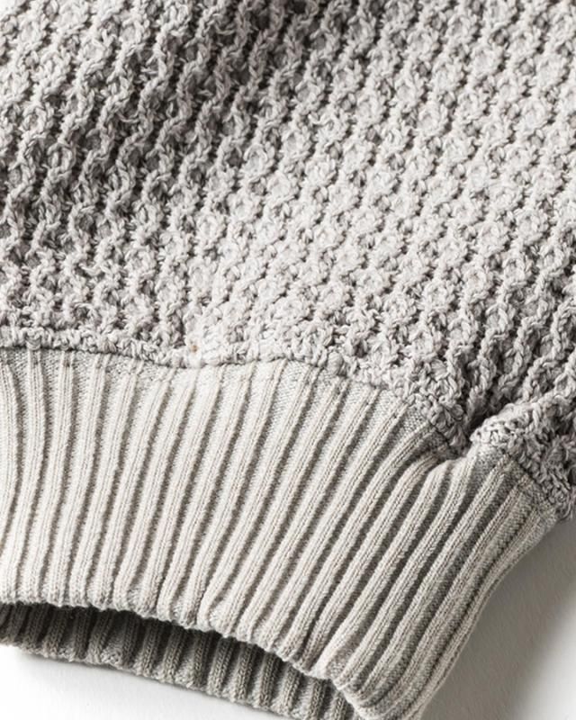 太番手のコットンとポリエステルで立体感のある複雑な編み地に交編されたニット生地を採用。