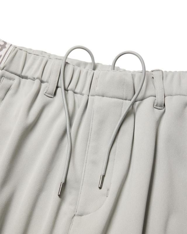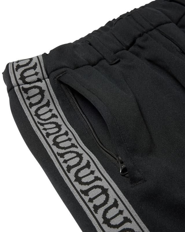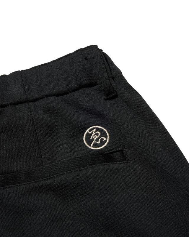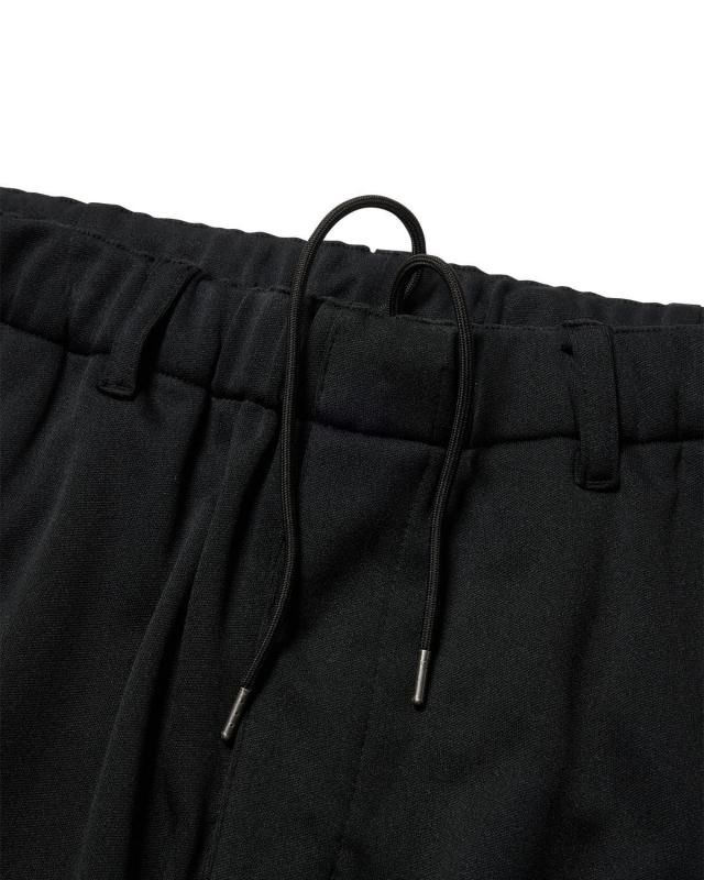 Eロゴジャカードテープがポイントのトラックパンツ。程よい厚みと弾力、ストレッチ性のある滑らかな質感の3段スムースジャージ素材を使用。ウエストにはベルトループと内出しの腰紐付き。フロントはフライファスナー仕様。