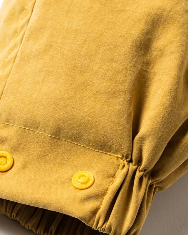 ゴムシャーリングの袖口はドットボタンのアジャスター付き。