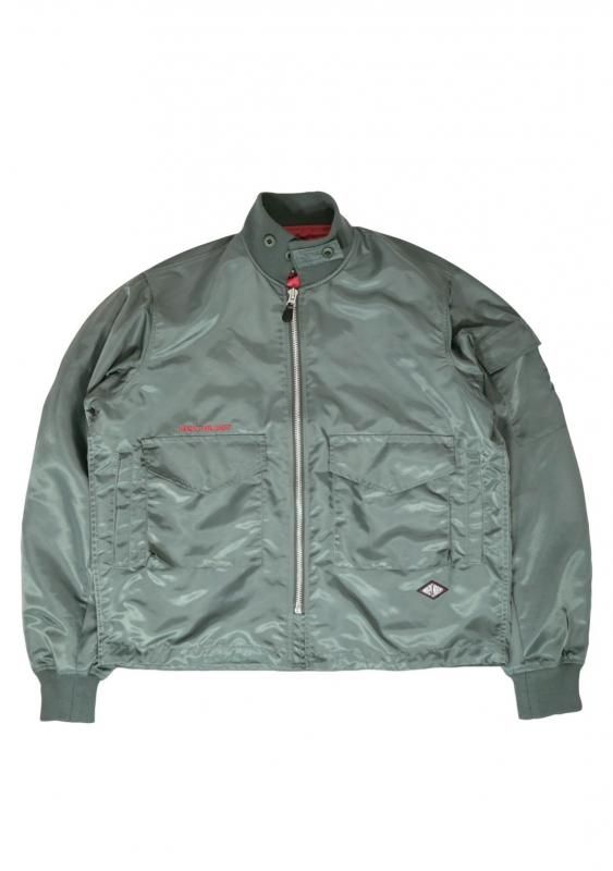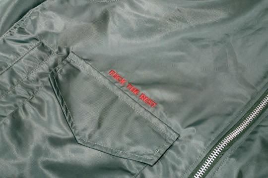 G8 JACKET をベースに着丈、身幅を現代のスタイルにアレンジしたリラックスフィットジャケット。MA-1等のフライトジャケットに使われるナイロンツイルを使用。左ポケット下にブランド織ワッペン、右ポケット上にブランドスローガン「FUCK THE REST」。左右のフラップ付きポケット、ハンドウォーマー、裾にドローコードを配備。