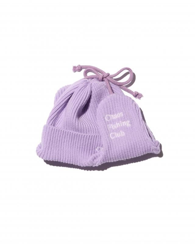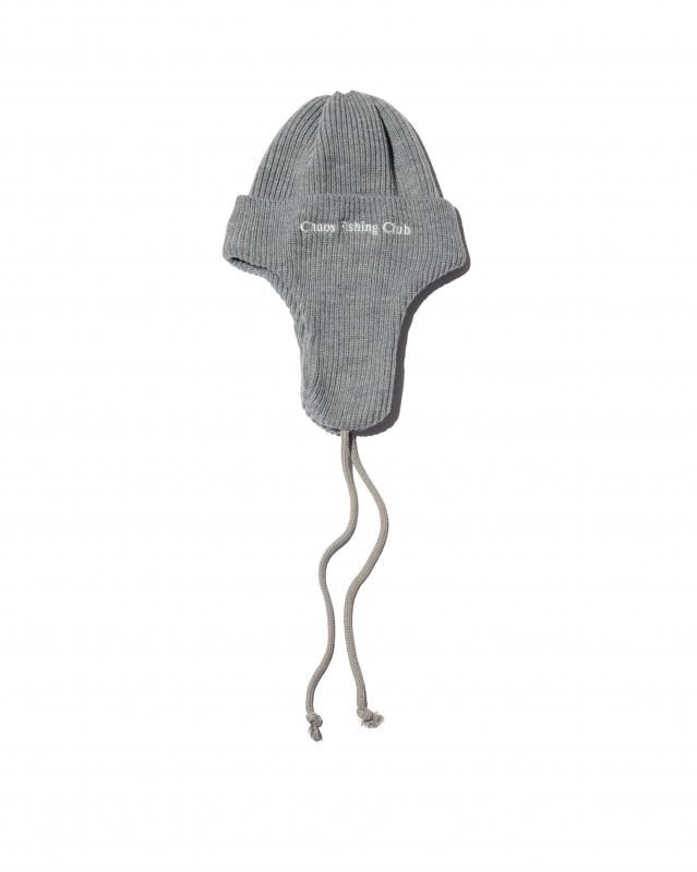 イヤーフラップ付きのニット帽。ストラップを頭上で結びウシャンカのようにかぶったり、フラップを垂らして耳あて付きニット帽としてかぶれる2way仕様。