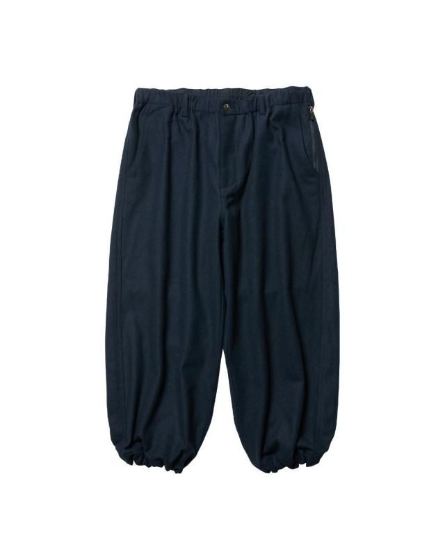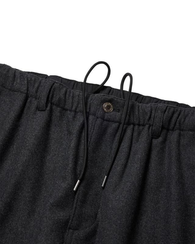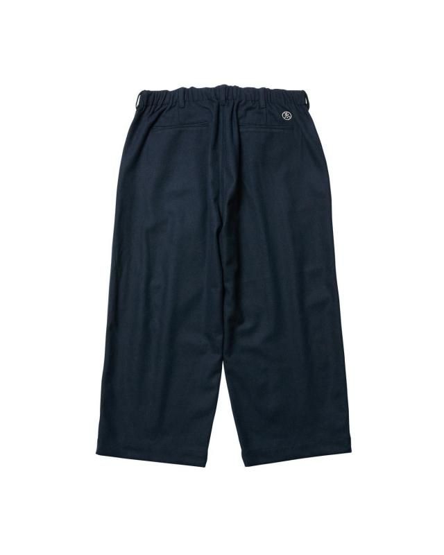 温かみのあるウール混のフランネル生地を使った新型のワイドパンツ。ウエストにはベルトループと内出しの腰紐付き。フロントはフライファスナー仕様で、タックボタンもロゴ入りのオリジナルデザイン。前後左右の腰ポケットに加え、左サイドシームに沿ったジップポケット付き。膝付近まで裏地素材を使用し、ウール独特の肌触りにも対応。右腰にはシルバーの“ゑ”刺繍入り。裾はアジャスター付きドローコード搭載なので、裾までワイドに広げて街で遊んで、スケボーするときはちょっと絞る、なんてのも可能です。